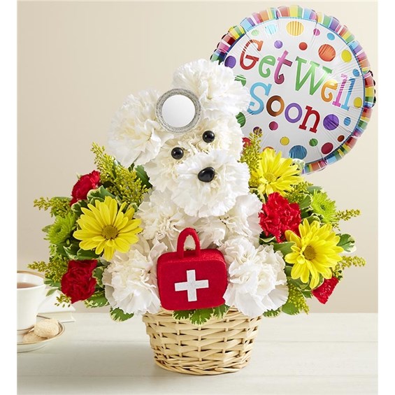 Our doggie doctor is the perfect pick-me-up for anyone feeling under the weather—and he loves to make house calls! From our signature collection, this cute creation is surrounded by a vibrant bunch of blooms, ready to brighten anyone’s day. Add an uplifting balloon to get them on the mend in no time. Baskets may Vary